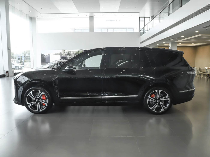 再来看车身侧面部分,车身侧面延续了蔚来家族的优雅基因,富有力量感的双肩线与近乎水平的车窗水切贯穿全车,搭配 2.5m² 超大面积纯平侧窗,营造出修长舒展的视觉效果。隐藏式门把手设计不仅提升了整体美感,更能够降低风阻系数,比老款提升明显。宽舷肩线与小间隙差的工艺细节,让车身如同身着 “宽肩礼服”,尽显豪华质感。轮毂提供 21/22 英寸两种尺寸,22 英寸星芒造型轮毂搭配低风阻设计,兼具时尚感与实用性。靠近车辆时,悬架自动下降,配合投影光毯与门板照地灯的迎宾仪式,让每次上下车都充满仪式感。
